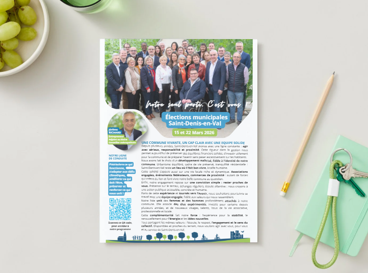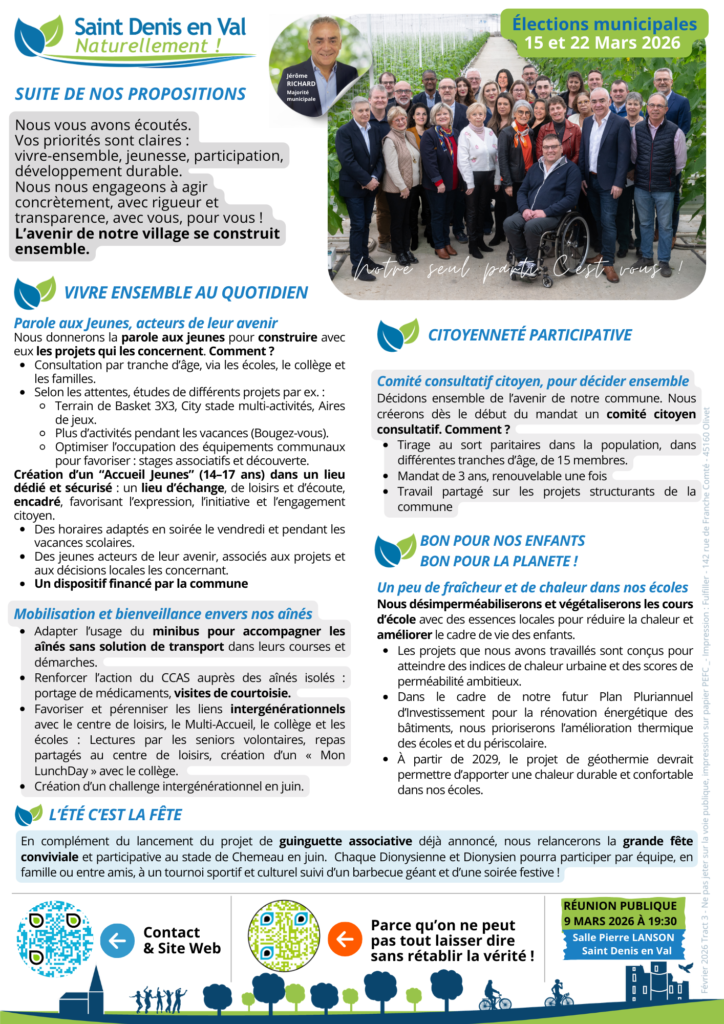 Face aux défis actuels : désertification médicale, transition énergétique, préservation du lien social, notre liste propose des solutions concrètes, fruit d’une écoute citoyenne approfondie, mais aussi d’une expérience de plusieurs mandats. Nous pouvons tous en convenir, à Saint Denis en Val, la vie est plutôt agréable et riche en activités associatives. Ce bien vivre, pour certain(e)s d’entre nous, nous y avons contribué. Nous souhaitons, si vous le décidez, pouvoir poursuivre notre action pour un nouveau mandat, conscients et concentrés sur les grands défis à relever !
